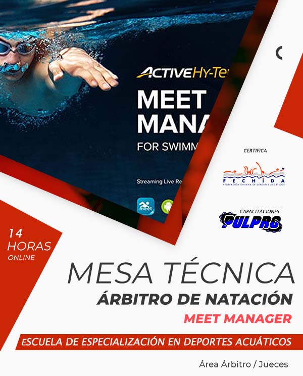 La mesa técnica en el desarrollo de una competición es una función clave que suele contar con pocas personas capacitadas para desarrollarla. El curso entrega los conocimientos necesarios para aprender a manejar el software que actualmente se utiliza en todo el mundo para el desarrollo de competencias de natación Meet Manager desde la instalación, requerimientos mínimos, información sobre licencias, configuración, creación de campeonatos, gestión durante el campeonato, funciones de la mesa técnica, entrega de reportes y resultados, publicación de resultados en vivo.
